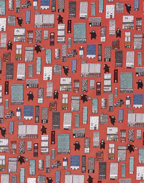 バッグ片手に、くまモンが銀座でショッピング!?リアルな銀座のビルと、くまモンの対比が可愛らしいネクタイ。好奇心いっぱいに銀ブラを楽しむくまモン。銀座熊本館へも立寄ったことでしょう。